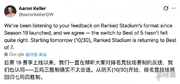 此前的更新中,《守望先锋2》角斗领域排位从之前的BO7(7局4胜)改成了BO5(5局3胜)。不过在更改之后,社区反响出现了普遍差评,很多玩家觉得BO5进度过快,降低了游戏的成长性。因此近日守望先锋总监Aaron Keller发表推文,确认《守望先锋2》角斗领域排位将改回BO7模式。