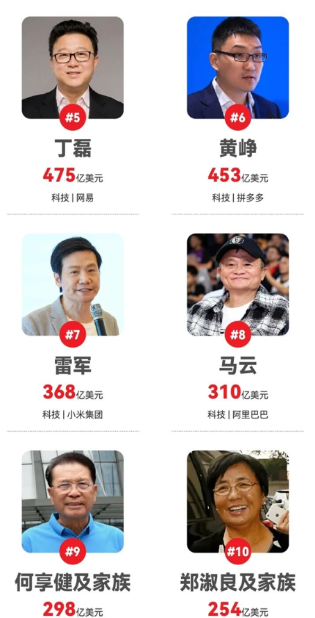 腾讯董事会主席马化腾的财富增长超过三分之一,达到628亿美元,排名第三。