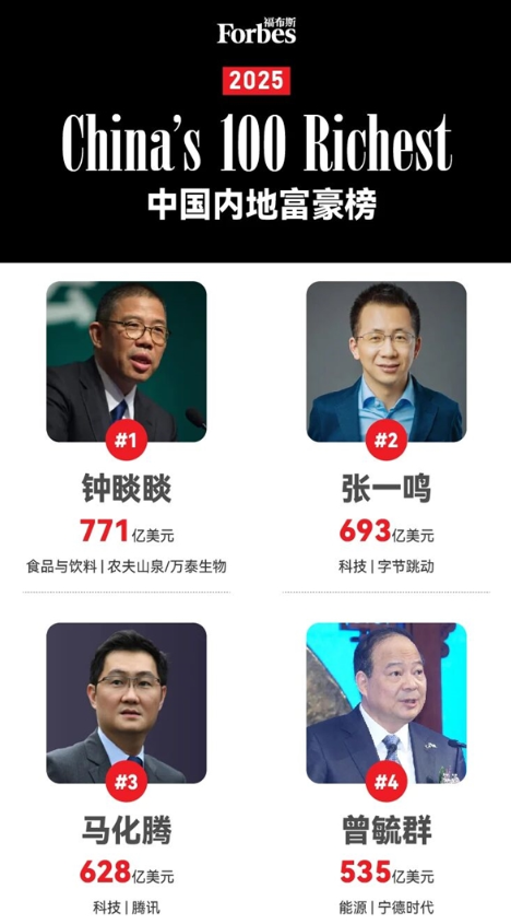 农夫山泉创始人钟睒睒连续第五年蝉联榜首,其财富增长263亿美元,达到771亿美元,成为本次身家金额增长最多的富豪。2025年上半年,钟睒睒旗下的饮用水及饮料巨头实现了净利润与营收的双位数增长。