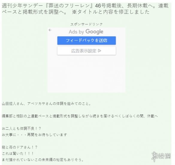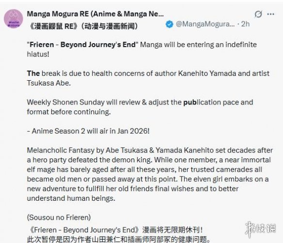 据多家外媒消息称,人气漫画《葬送的芙莉莲》宣布将于下周连载更新后进入长期休刊,原因是为了原作者山田钟人与作画阿部司身体健康考虑。