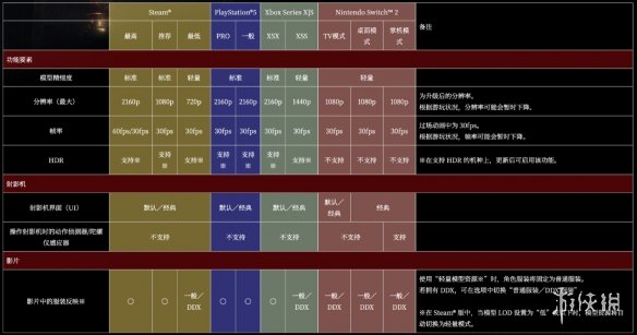 《 零~红蝶~重制版 》各平台性能与功能对比图已正式公开。除Steam平台外,本作在其他平台均以30帧运行,同时Switch 2版本将不提供HDR支持。