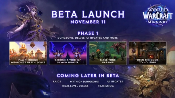 暴雪官方正式宣布,《魔兽世界》"至暗之夜"资料片Beta测试将于11月12日正式开启。此次测试将分为三个阶段陆续开放游戏内容,为正式版的发布做最后准备。拥有外服客户端和账号的玩家可通过两种方式参与:预购史诗版的玩家将直接获得测试资格,未预购的玩家则需要通过申请抽取资格,中选者将通过邮件获得指引。