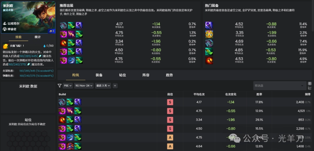 推荐莫雷洛秘典,朔极之矛,虚空之杖作为米利欧在云顶之弈中的最佳出装。米利欧最热门的出装是珠光护手,纳什之牙,朔极之矛。