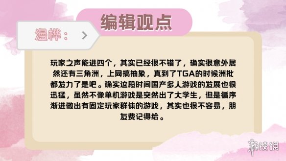 不过每年最容易引起混战的玩家之声也并非没有看头,毕竟在法国佬混的风生水起的同时,国产游戏也不容小觑。