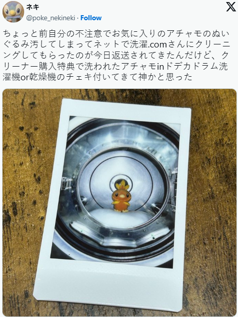 近日,一位日本网友在X平台分享的“火稚鸡玩偶清洗经历”引发广泛回响。推主ネキ(@poke_nekineki)因不慎弄脏心爱的火稚鸡玩偶,委托专业布偶清洗公司“洗濯.com”进行清洁。令她惊喜的是,当玩偶被送回时,不仅焕然一新,包裹中还附有一张玩偶在巨型滚筒洗衣机或烘干机中被清洗的拍立得照片,让她不禁赞叹:“这服务也太神了!”