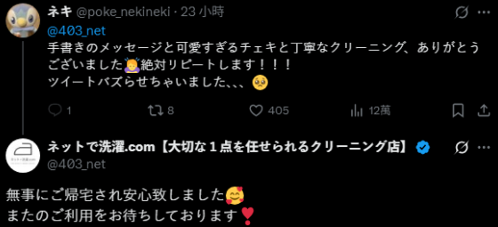 ネキ在贴文中感动地写道:“手写留言、可爱到不行的拍立得,再加上细致的清洁服务,真的非常感谢!我一定会再次光顾!”“洗濯.com”官方账号也亲切回应:“看到火稚鸡平安回家,我们也安心了,期待您再次使用我们的服务。”