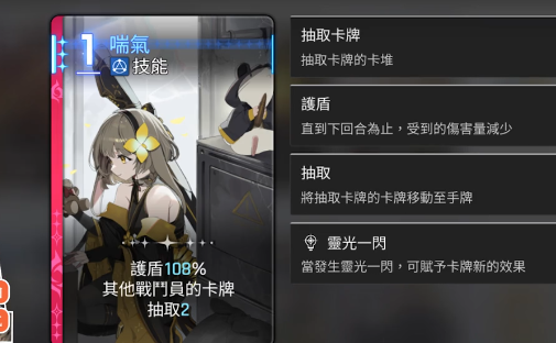 先来看一下通过灵光一闪获取的卡牌。喘气在一费就可以带来100%的护盾,还可以抽取其他两个战斗员。不管是高速卡组,还是低速卡组,全部都是比较强的抽卡,可以精准的抽到一些关键牌。灵光一闪衍生形态里面比较常用的那就是衍生一,衍生二会比较注重于自身的输出。衍生三则属于零费的上盾,但是稳定性相对是比较差的。最后那自然就是准备发射的搭档卡准备轰炸。可以有效增加上膛的上限,在高速卡组中就能进一步的提升输出。很多人都会把这个角色和百丽儿放在一起对比,其实这个角色擅长的就是补伤害,并且并不会占据资源,所以很适合。