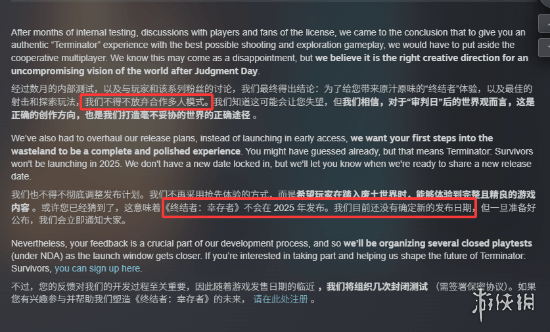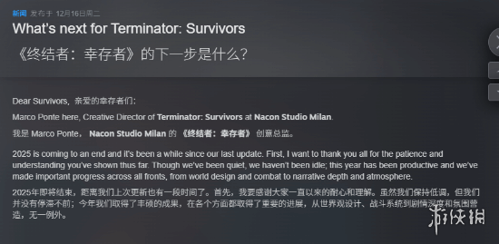 在最近的一则Steam社区官方公告中,Nacon Studio Milan正式确认,开放世界生存游戏《 终结者:幸存者 》将再次延期,确定不会在2025年内发售,具体发售日期待定。这已是该作的第二次延期——工作室曾在2024年宣布从原定发售窗口推迟至2025年。