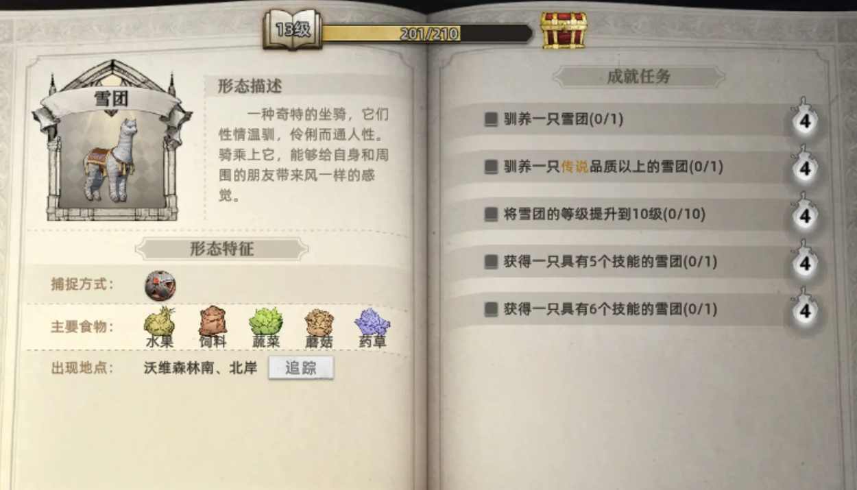 在玩家们触发了成就任务之后,玩家们会发现有捕捉一个叫雪团的羊驼任务,羊驼本身是一个性情温顺的宠物,并且由于它的体积较大,它还可以让玩家们进行乘坐,他本身出现的地点比较少,一个是沃维森林南,另外一个则是北岸,当玩家们做这个任务的时候,可以直接在出现地点的后面进行追踪,但是玩家们必须要注意一点,羊驼的刷新地点是随机的,它并不会稳定的在某一片区域持续出现,所以没有遇到羊驼的小伙伴们可以将地图多刷新几遍。