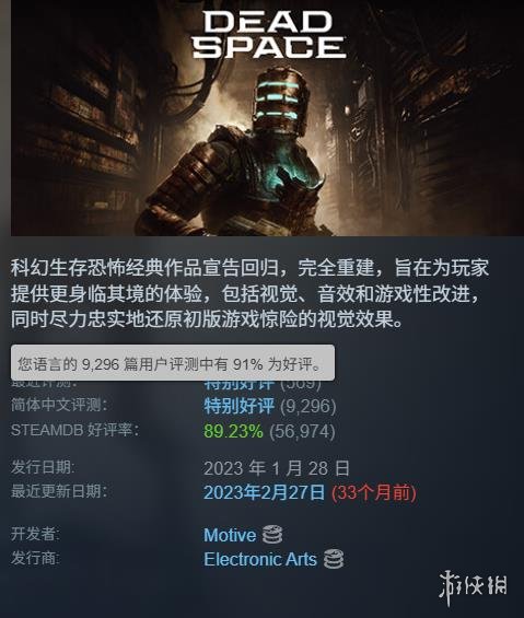 近日,《 死亡空间重制版 》迎来1.5折新史低价,标准版售价37.2元,豪华版售价44.7元。目前该作在Steam评价为“特别好评”,好评率达91%。
