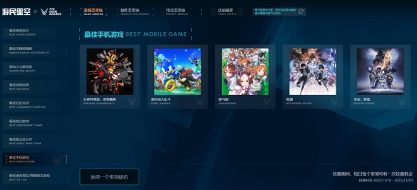 本届TGA年度游戏颁奖礼提名名单已正式公布,在“最佳手游奖”类别中,共有五款游戏获得提名,包括《命运:群星》《女神异闻录:夜幕魅影》《索尼克大乱斗》《赛马娘》以及《 鸣潮 (Wuthering Waves)》。