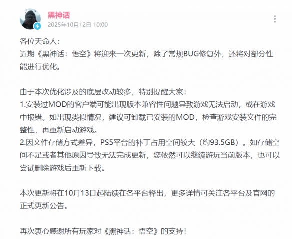 今日,游戏科学正式发布公告,宣布《 黑神话:悟空 》将于近期推出全新更新内容,预计自10月13日起逐步面向各平台发布。本次更新除常规问题修复外,还将对游戏部分性能表现进行优化提升。