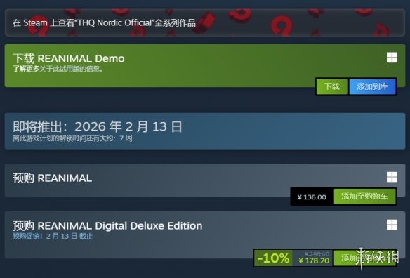发行商THQ Nordic现已开启将于2026年2月13日发售的《REANIMAL(生灵重塑)》Nintendo Switch 2数字下载版的预购。普通版价格含税5720日元(折合人民币约257元),豪华版目前享九折优惠,含税7623日元(折合人民币约343元)。