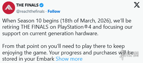 就在《ARC Raiders》成为2025年口碑与热度双丰收的爆款游戏时,开发商Embark宣布其前作《THE FINALS》的PS4版本将于明年3月停止支持,此时距该版本上线尚不足一年。官方在推文中解释此举旨在“集中资源支持当代主机平台”,并承诺“玩家进度与已购内容将通过Embark ID跨平台继承”。