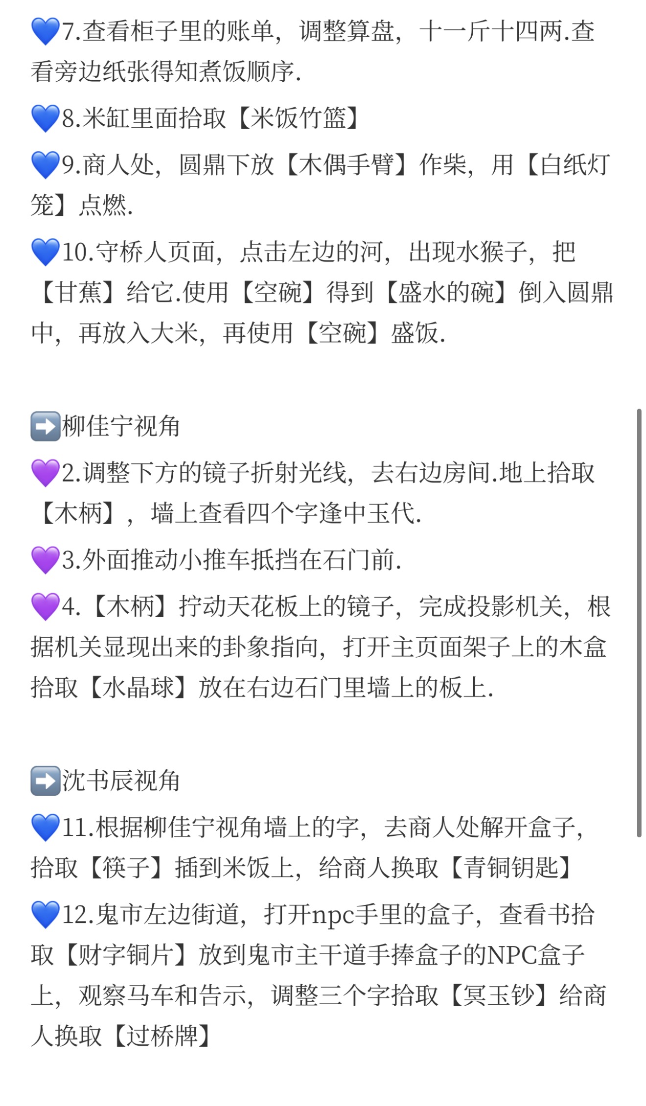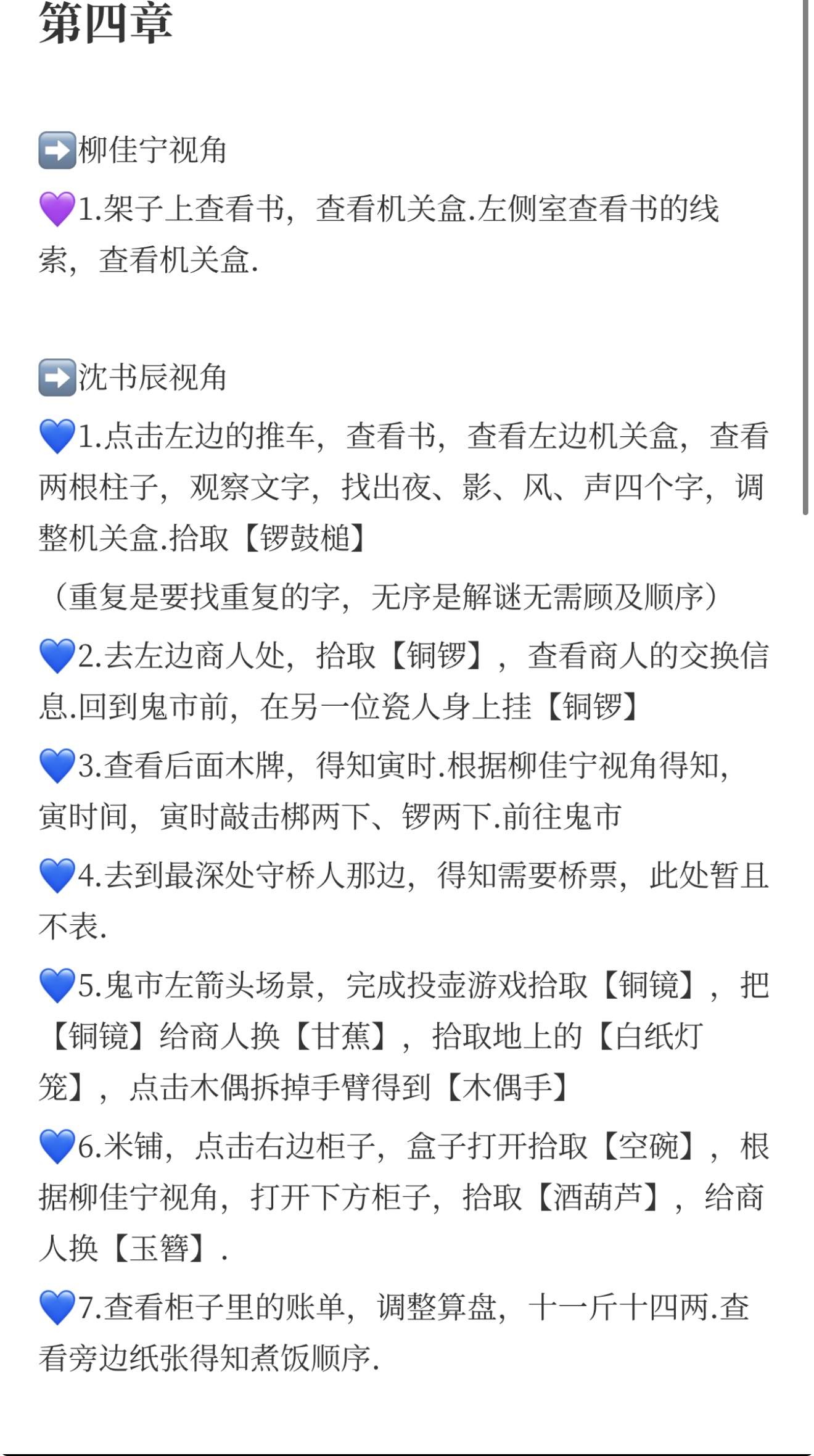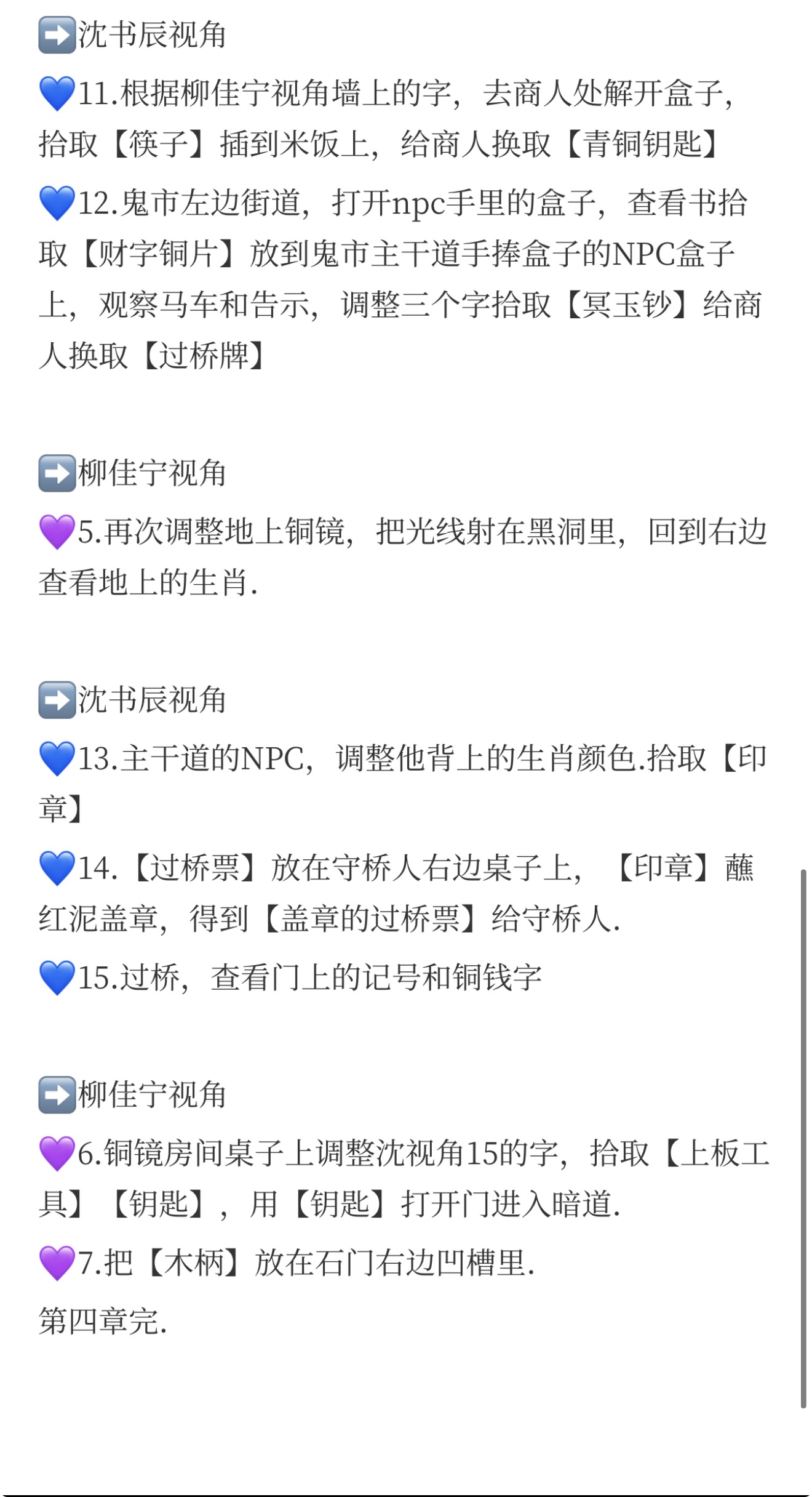 《缠重山2冥玉钞》第四章通关攻略来了:第四章需双视角切换 解谜 。沈书辰在鬼市通过投壶、交易获取过桥票,并依据柳佳宁处的线索“逢中玉代”解开商人盒子。柳佳宁则通过调整镜面折射破解机关,双方协作完成生肖颜色对照与过桥手续,最终开启暗道。