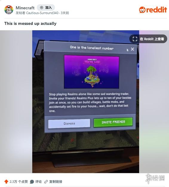 这就好比你去饭店吃饭,服务员非说“一个人吃饭多惨啊”来推销大桌餐。事件的起因是Reddit用户Cautious-Surround340发布的一张游戏内截图。这则旨在推广Realms Plus(支持更多人联机的高级订阅服务)的广告文案写道:“1是最孤独的数字。别再像个悲伤的流浪商人一样独自在Realms里玩耍了。邀请你的朋友吧!Realms Plus支持最多10个‘死党’同时加入……”