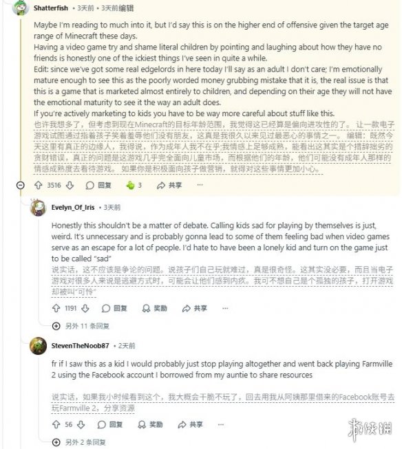 评论区中,更有玩家犀利吐槽:这就是典型的“E人(外向型)霸凌I人(内向型)”。有些玩家甚至表示,这种营销方式让原本不想社交的玩家感受到了冒犯,尤其是考虑到还有许多未成年玩家可能真的没有那么多可以随时上线的朋友。Mojang这次为了卖服务器而在玩家雷区蹦迪的行为,属实是有点“情商掉线”了,这种看似幽默实则刻薄的文案,显然低估了“电子独处”对于现代玩家的重要性。