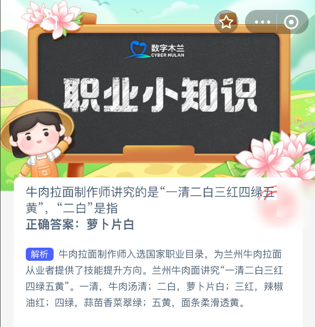 牛肉拉面制作师讲究的是“一清二白三红四绿五黄”,“二白”是指?【蚂蚁新村每日一题】2025年11月17日题目已发布!坚持答题,积累木兰币,即可加速小镇建设。答对本题,立即可享“产速+3/时”的加速奖励!今天正确答案是【萝卜片白】。牛肉拉面制作师讲究的是“一清二白三红四绿五黄”,“二白”是指萝卜片白。