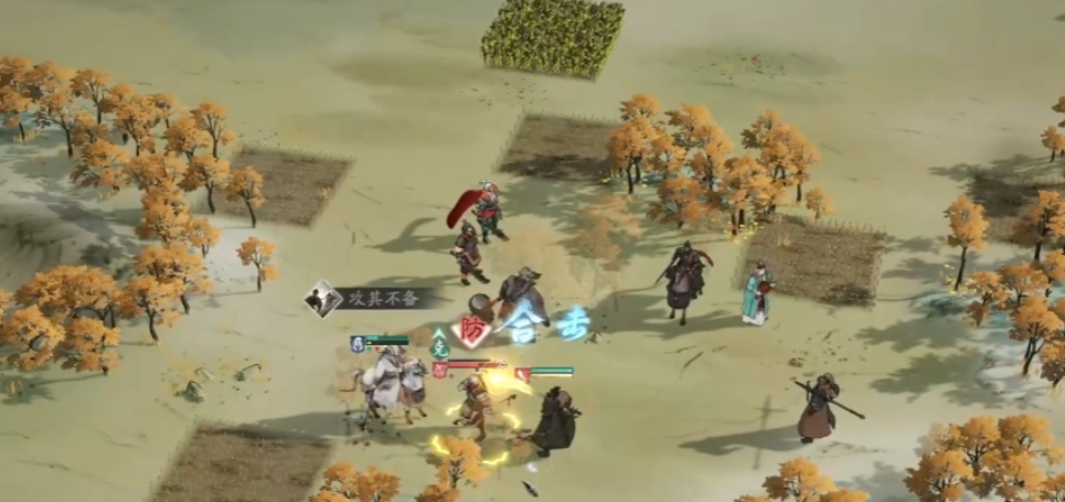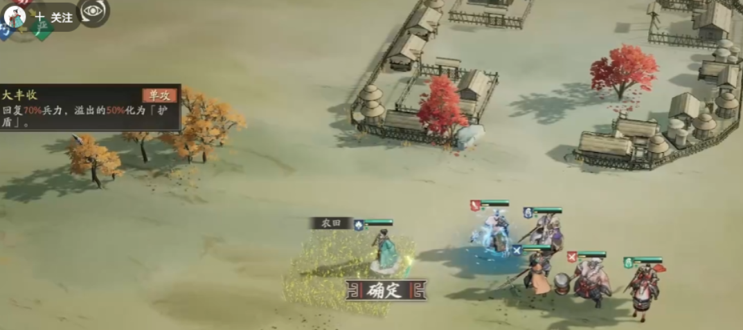 来到战斗中首先要做的就是占领地图上的农田,它能够恢复你70%的兵力或者转化为50%的护盾,这个buff在战斗中是十分重要的,尤其是在你兵力即将耗尽的时候,这个buff能够给你带来十分重要的援助,占领后及时回血,为后期战斗做准备。在战斗的最开始阶段,要注意自己的兵力不要太过于分散,特别是在战斗刚开始敌人正在一步一步的接近你的时候,可以派一些武将去找敌方的小兵打几个小范围的战斗,这样就可以把敌人分散开来,为进攻打开通道。