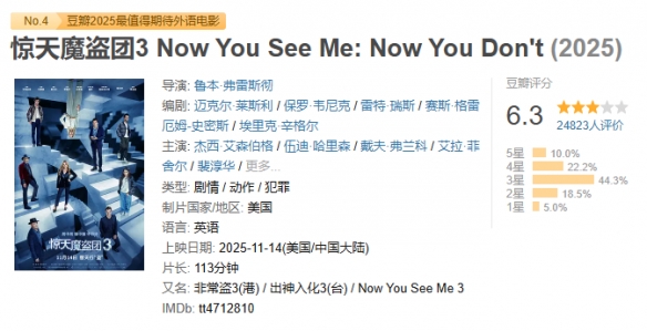 3.《惊天魔盗团3》豆瓣开分仅6.3分 远低于前两部
