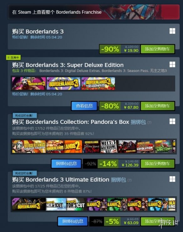 在Steam平台,《无主之地3》-90%优惠,售价19.9元。此外,《无主之地3: Super Deluxe Edition》-80%优惠,售价67.8元,《Borderlands Collection: Pandora's Box》-92%优惠,售价194.22元,《无主之地3: Ultimate Edition》-87%优惠,售价63.09元。