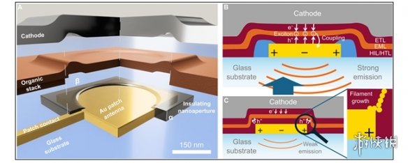 研究人员指出,传统OLED像素的简单微缩无法突破微型化技术瓶颈。在极小尺度下,电流分布不均会导致电荷集中在天线边缘,长期运行易引发短路故障。