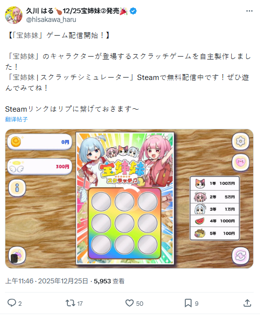 日本漫画家久川はる为了宣传旗下在「Young Gangan」杂誌杂志连载中的作品《宝姉妹》,12 月 25 日于 Steam 平台推出了一款名为《宝姉妹 | スクラッチシミュレーター》的免费游戏。这款模拟游戏由漫画家本人与游戏制作 VTuber 园児ニア共同开发,让玩家通过 PC 就能体验刮刮乐的乐趣,连机率都是接近现实刮刮乐!