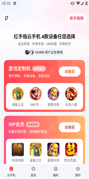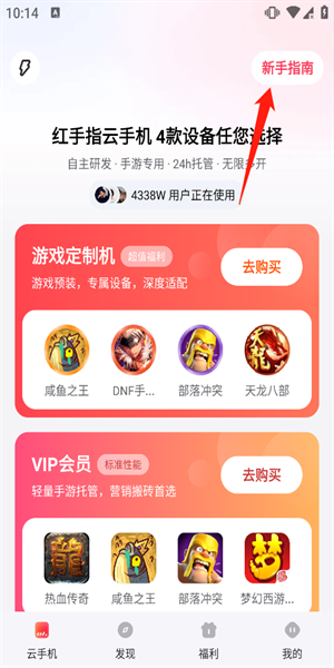 红手指专业版app有什么功能,首先需要打开软件进入主页,在云手机界面可以看见购买游戏、充值会员,这里我们点击右上角的新手指南,在这里会有详细的步骤可以操作。