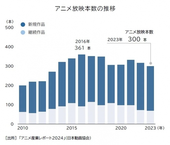 但与此同时,动画播出数量却呈下降趋势。2016年曾达到361部的峰值,到2023年已降至约300部。然而,市场规模却从2016年的2000多亿日元,增长至2023年的约3482亿日元。从另一个角度来看:单部作品的制作成本正在显著提高。