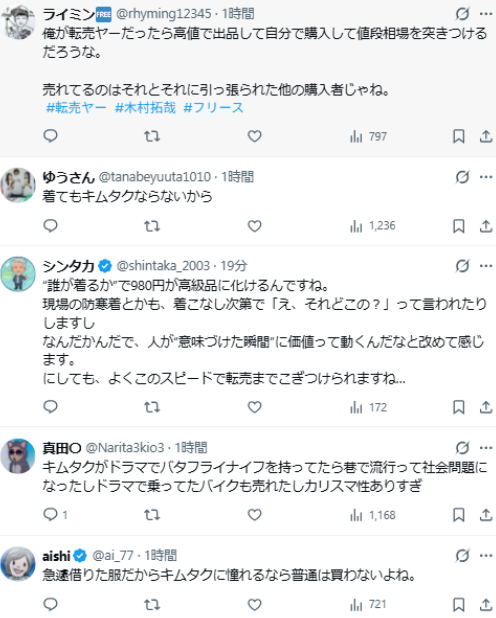 买不到的需求涌向了二手平台,随即出现了大量标注“木村拓哉着用外套”的商品列表。这件原价980日元的外套,转售价格瞬间飙升至原价的10倍以上。更有甚者,在描述中完全不提“Workman”品牌,只强调“木村拓哉同款”,利用“木村穿的=名牌”的固有印象牟利,此类行为让许多粉丝感到气愤。
