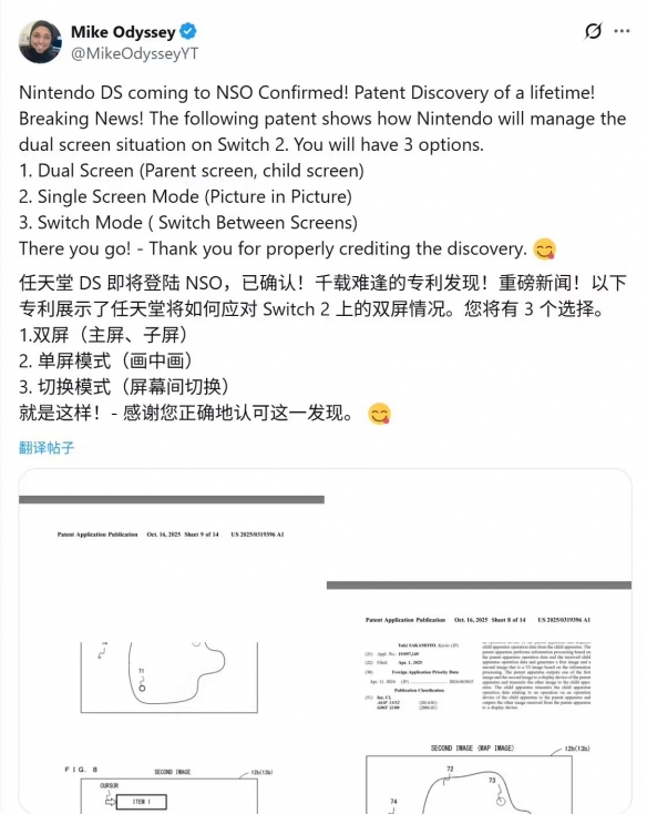 爆料人@MikeOdysseyYT于昨日(10月16日)在X社交平台发布动态,披露了任天堂新近获批的多项专利信息。这些专利揭示了适用于Switch 2主机的创新双屏配件设计方案,旨在为用户重现经典掌机DS与3DS的标志性游戏体验。