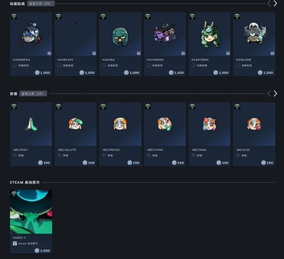 《哈迪斯2》在Steam点数商店中总共包含4个动画头像、3个头像边框、3个迷你个人资料背景、8个个人资料背景、10个动画贴纸、10个表情以及一部启动影片。