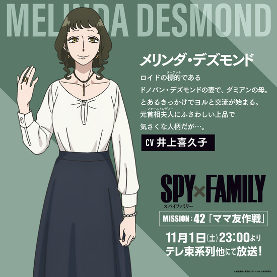 远藤达哉漫画作品《间谍过家家》动画官方X(原推特)账号近日宣布,知名声优井上喜久子将以梅琳达·德斯蒙一角加盟第三季阵容。作为多诺万·德斯蒙之妻与达米安的母亲,该角色将于11月1日播出的动画第42集(第三季第5集)首度登场。