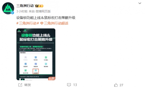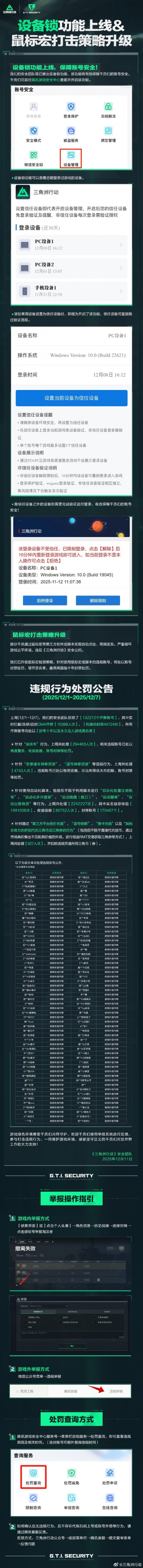 腾讯《三角洲行动》于2025年12月11日宣布,其游戏安全功能迎来重大升级:全新的设备锁功能正式上线,同时针对鼠标宏等作弊行为的打击策略也进行了全面强化。