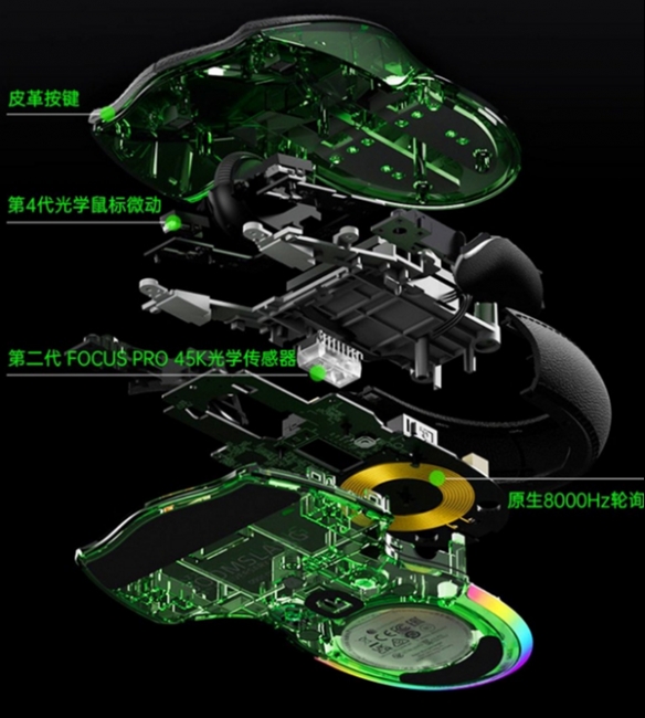 从官方公布的外观来看,这款纪念版鼠标继承了Razer Boomslang的经典设计,最大亮点在于无线功能(仅支持底部无线充电)。其按键和尾部均采用皮革包裹,手感更为奢华。鼠标的三围尺寸为138.4 x 81.9 x 34.5mm,重量约为110g。充满电后的续航表现非常出色:在1000Hz模式下可持续使用145小时,而在8K模式下为26小时。
