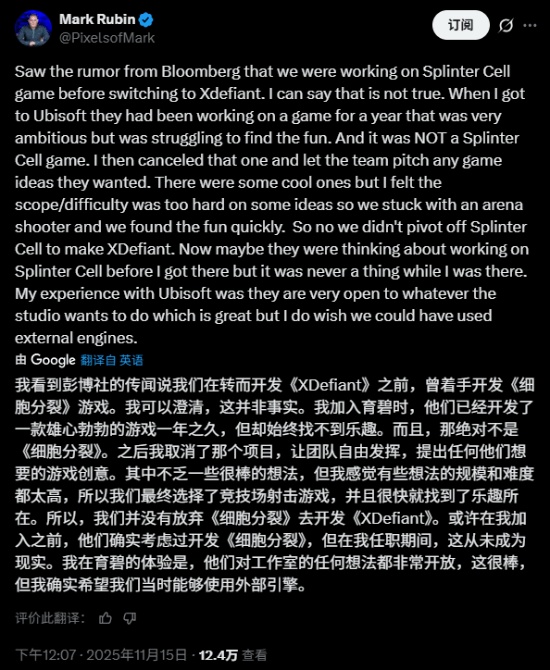 近日有传闻称,育碧曾将一款开发中的《细胞分裂》新作转型为现已停服的《 汤姆克兰西:XDefiant 》。对此,《不羁联盟》前执行制作人Mark Rubin在社交平台上公开驳斥了这一说法。