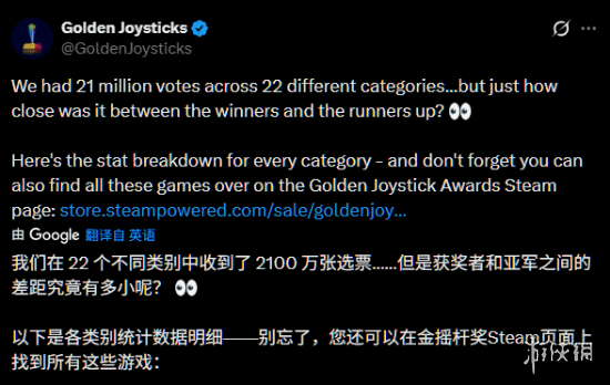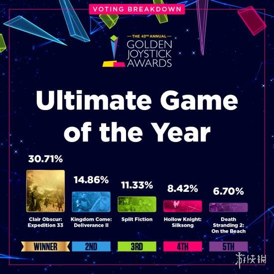 金摇杆奖官方于今日凌晨在社交媒体上引爆话题,宣布本届大奖总共收到来自全球玩家投出的2100万张选票!在最关键的“年度最佳游戏”争夺中,《光与影:33号远征队》以30.71%的得票率取得压倒性胜利,其票数规模高达第二名《天国:拯救2》的两倍之多,玩家呼声可谓一骑绝尘。