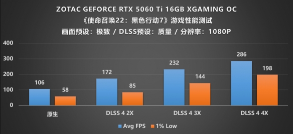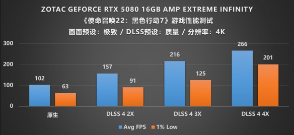 作为索泰的旗舰级显卡,如此扎实的用料配置面对最新的《使命召唤 22:黑色行动 7》自然是不在话下,我们将画面预设为极致,DLSS预设为质量模式,考虑到显卡本身的旗舰定位,分辨率自然是要上到4K,在所有设定完成后,可以在图中看到,在原生渲染的情况下,4K画质的帧率能够达到139帧,1%Low帧也接近85帧,这时候流畅游玩不成问题,不会出现卡顿的情况;紧接着我们打开DLSS 4帧生成,并调整倍率至2X,帧数竟直接跃升至224帧,帧率增幅达到了将近70%,这还没完,我们进一步又测试了3X和4X的DLSS 4帧生成倍率,帧数又实现了呈梯度式地增长,3X时从224提高到303,打开4X则又提升至最高帧377,可以说是一山更比一山高,在4K的极致画质下能实现丝滑流畅的游戏效果真是令人赞叹不已,这也许就是旗舰所赋予的意义吧。