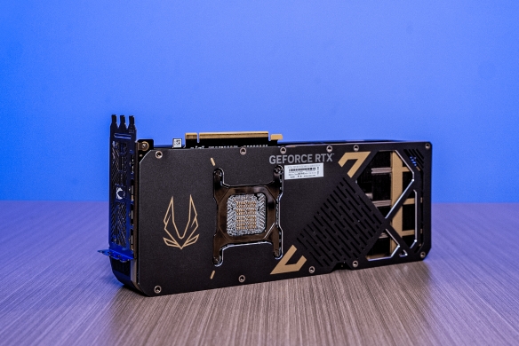 首先出场的便是索泰的当家旗舰产品——索泰 RTX 5090 D v2 24GB SOLID OC,和多数显卡靠花哨灯效、复杂纹路博眼球不同,索泰RTX 5090 D v2在外观颜色上显得冷酷低调许多,机身由高强度合金铸形打造而成,显卡的正面能看到笔直的刀刻条纹贯穿整个炭黑色的机身,搭配上三枚环刃风扇的叶片,冷酷却不失美感;显卡的背板则印有金色的索泰LOGO和少许不规则的暗金色镀铬条纹,经过特殊涂层工艺打磨处理,使得整体外观更加硬朗,在细节处又不忘彰显旗舰级独特的高级感。