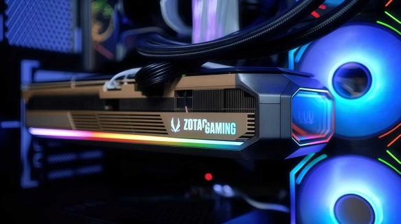 不仅如此,索泰RTX 5080 16GB AMP还采用了独特的“无限镜”设计语言,尤其是显卡侧边配备的SPECTRA 2.0 ARGB灯光,当插上电源的那一瞬间,侧边的索泰logo顷刻间变得流光溢彩,仿佛“天空之境”一般清澈透明,营造出悠远深邃的动态视觉感受,无限弥散在空间中,优雅中又带着科幻感。