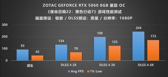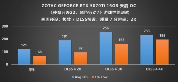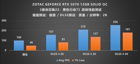 不同于RTX 5070Ti高昂的售价,RTX 5070才是常常被大众用户所考虑购入的区间,因为其相对请亲民的价格成为了市面上最主流的中端显卡,它的性能也是基本能满足主流用户的需求,由图可知,在最新发售的《使命召唤 22:黑色行动 7》中,RTX 5070的原生渲染帧率刚好过百,不过遗憾的是1%Low帧只有48,对于那些注重游戏流畅度的玩家来说或许有点瑕疵,不过没有关系,只需打开DLSS 4帧生成模式,当调节至2X倍率时帧率直接提升至157,1%Low也达到81帧的及格水平;当开启DLSS 4(3X)后帧率再度上涨了53帧,,直接拉满到4X倍率后,帧率持续增长,最终达到了256帧的完美效果,实现电竞级别的画质帧率体验,所以从最终游戏体验上来看RTX 5070并不逊色于RTX 5070Ti,可以说是花小钱办大事。