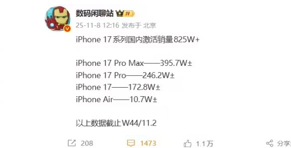 此前在11月2日,该博主曾透露iPhone 17系列国内激活量已突破825万台,这意味着在不到两周时间内又新增了近200万激活量,销售势头持续强劲。这一成绩也印证了苹果首席执行官蒂姆・库克在2025财年第四季度财报会议上的预期。