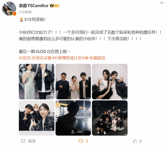 余霜写道:“S15结束啦!小伙伴们太给力了!!!一个多月,我们一起完成了无数个短采和各种拍摄任务!真的很感激能遇到这么多可爱又认真的伙伴!下次再见啦!!!最后一期VLOG也在路上啦~”