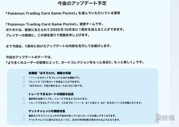 宝可梦社宣布,旗下将实体卡牌与数字体验结合的好评游戏《宝可梦卡牌Pocket》即将迎来最新更新。本次更新将上线多项玩家期待已久的实用功能,让我们率先了解。