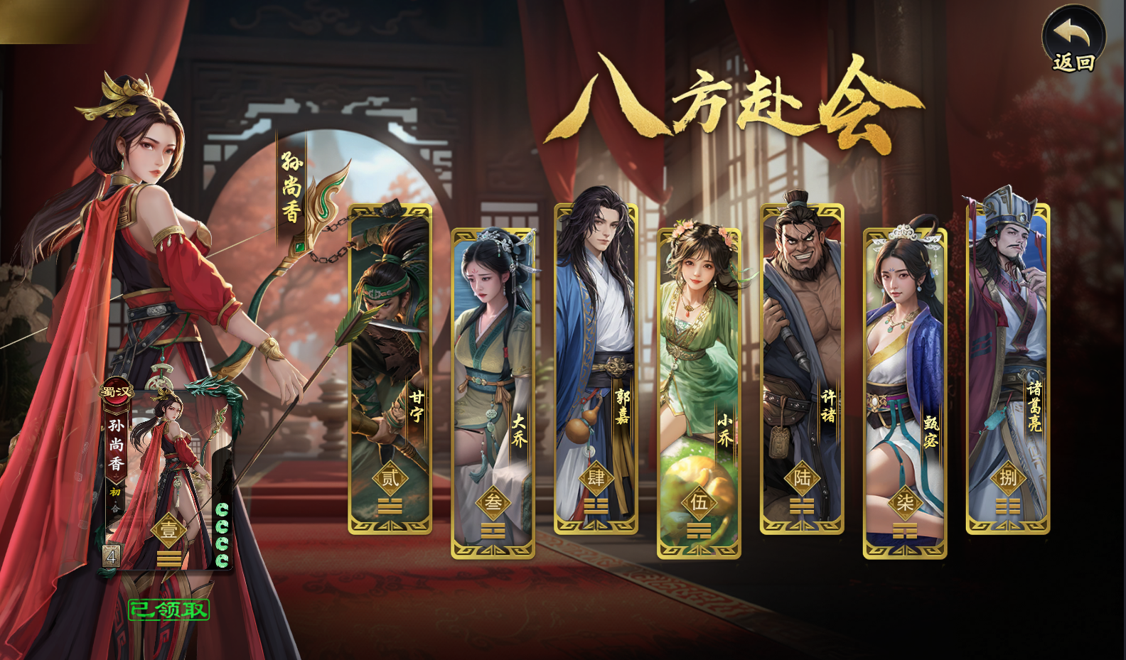 玩家在名将杀中建立了游戏号以后,打开活动页面会看到不少的活动内容,其中有一个八方赴会的活动,玩家只要每天登录以下游戏就能够获得孙尚香、甘宁、甄宓、郭嘉、许褚、小乔、诸葛亮等8个武将。