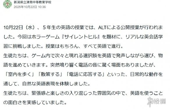 日本新泻县津南中学近日进行了一项开创性的语言教学实践——将小岛秀夫为《寂静岭》开发的传奇试玩版《P.T.》引入高二英语课堂。据该校官方博客介绍,担任助理语言教师的教员要求学生们在纯英语环境下操作并推进这款恐怖互动预告片。