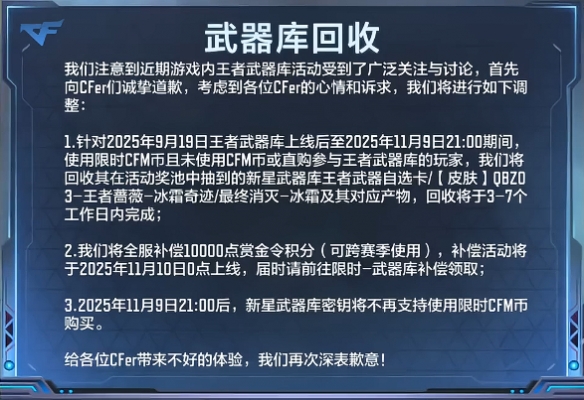 正常来说事件到这里也就截止了,但是在官方通告发出来后,仍有玩家靠着CFM币抽奖池抽取大奖,明显是游戏技术封禁不到位,于是官方直接来了一波狠的,再次发布公告将限时的CFM币抽到的大奖武器进行回收。好家伙,不管是不是工作室的白号还是玩家账号这下都被官方掏裤裆了。