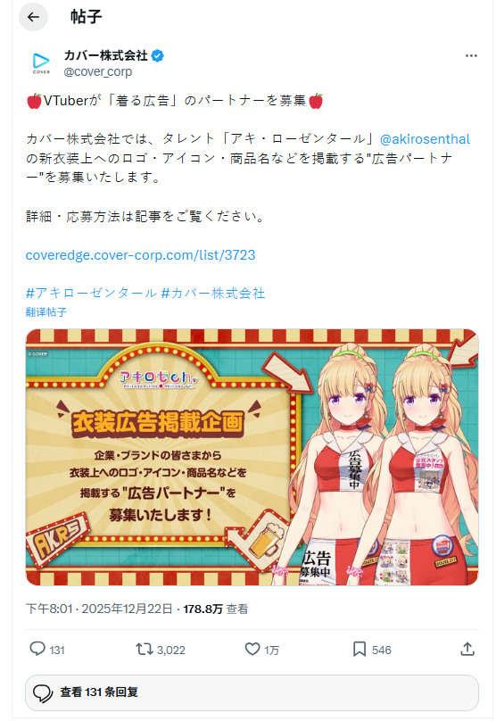 hololive JP 组 VTuber 亚绮 罗森塔尔(アキ・ローゼンタール,Aki)最近公开了以美式快餐店为主题的全新衣装,并同时宣布一项非常有创意的“穿着式广告”企划。因为新服装在胸口、短裤位置特别设计了“广告栏位”,开放给企业或品牌购买刊登权,让 Aki 在直播或活动中直接穿着赞助商的 LOGO 或商品名称进行宣传。hololive 母公司 COVER 提到此举旨在打破虚拟与现实的界线,创造粉丝、艺人与企业三方共赢的全新连结模式。