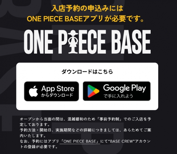 为避免开幕期间人潮拥挤,目前官方开放抽选预约入店时段。是否开放现场排队入场尚未确定。欲预约的粉丝需先于「ONE PIECE BASE」官方App注册“BASE CREW”账号方可参加抽选,详情请见官方网站。