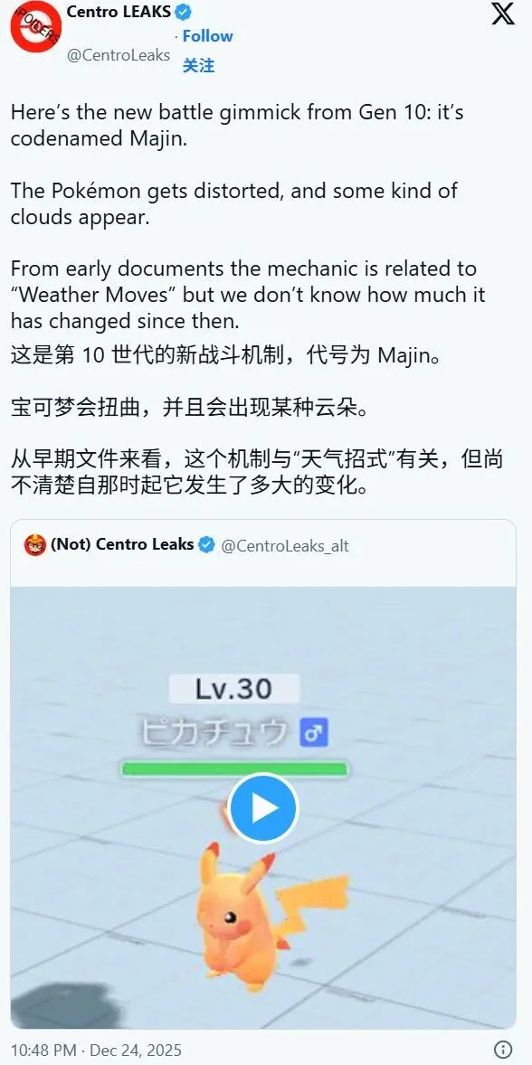按照《宝可梦》近年正统系列的惯例,每部新作都会引入一种全新的进化方式或形态,例如《朱/紫》的“太晶化”、《剑/盾》的“极巨化”等。而关于《风/浪》,本次传闻暗示本作将新增一个代号为“魔人(Majin)”的机制,并与天气系统密切相关,但其具体运作方式目前尚未明确。